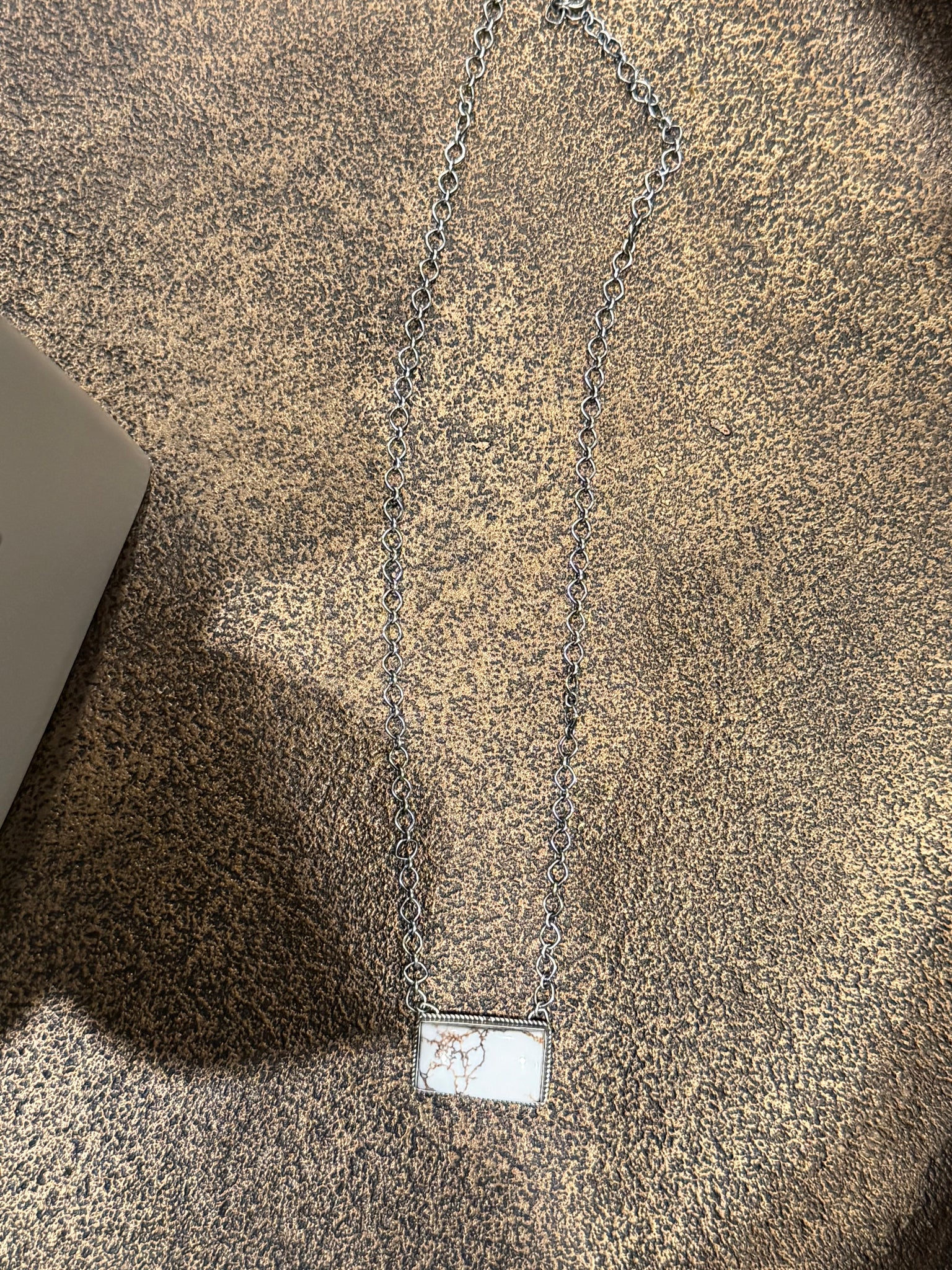 This Native-made White Horse bar necklace is handcrafted in sterling silver and stamped D&D.