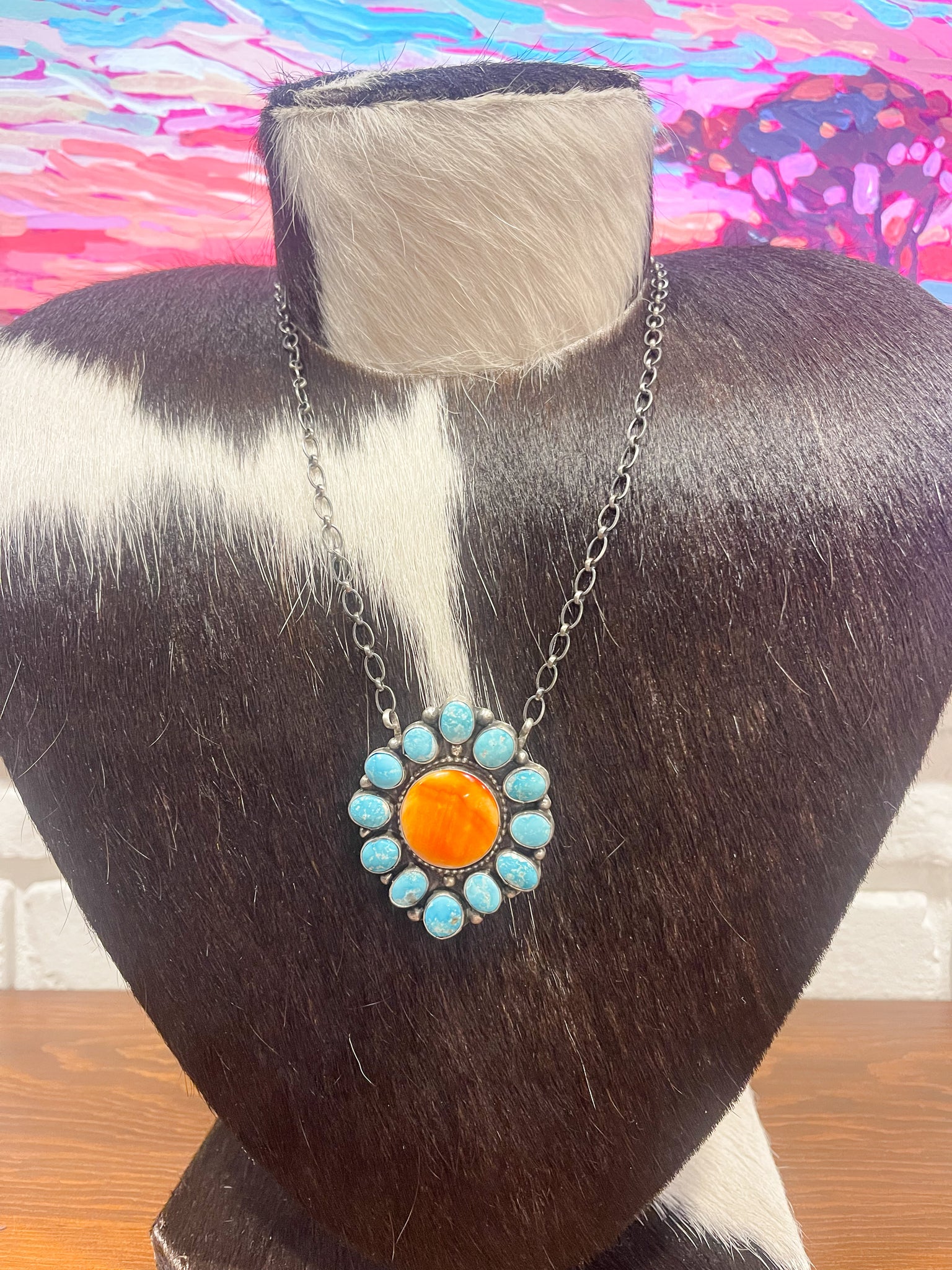 Orange Spiny and Turquoise Pendant Necklace Native Made