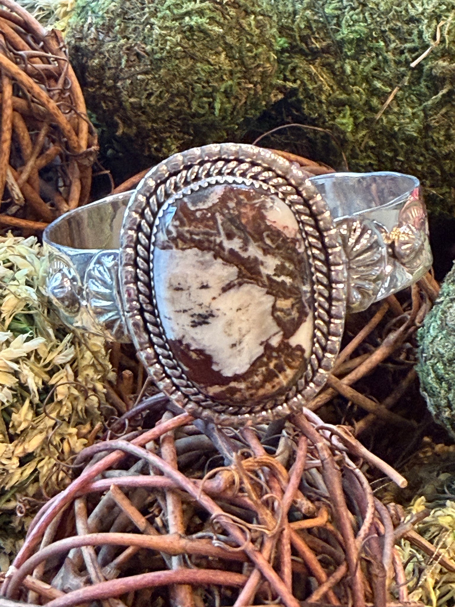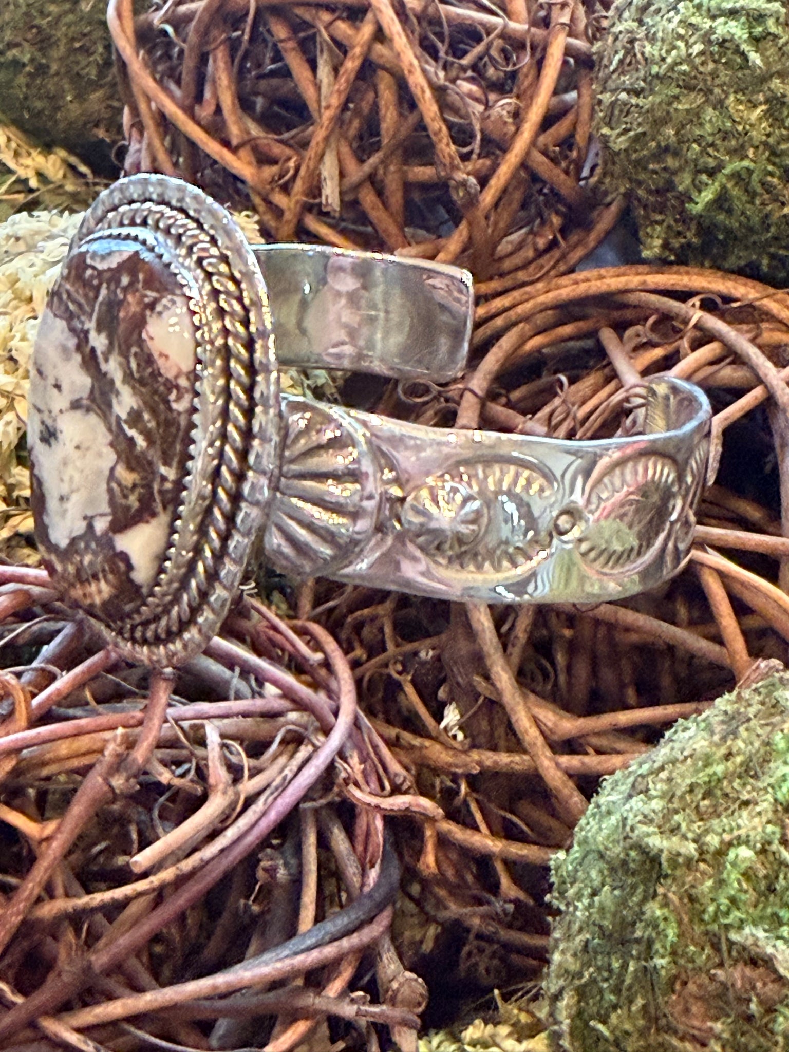 Grounded in tradition and made to be worn with confidence, this Wild Horse Cuff is a handmade sterling silver cuff crafted by a Navajo artisan and stamped for authenticity. Featuring natural wild horse stone, this piece reflects the raw beauty of the Southwest—earthy, bold, and timeless.