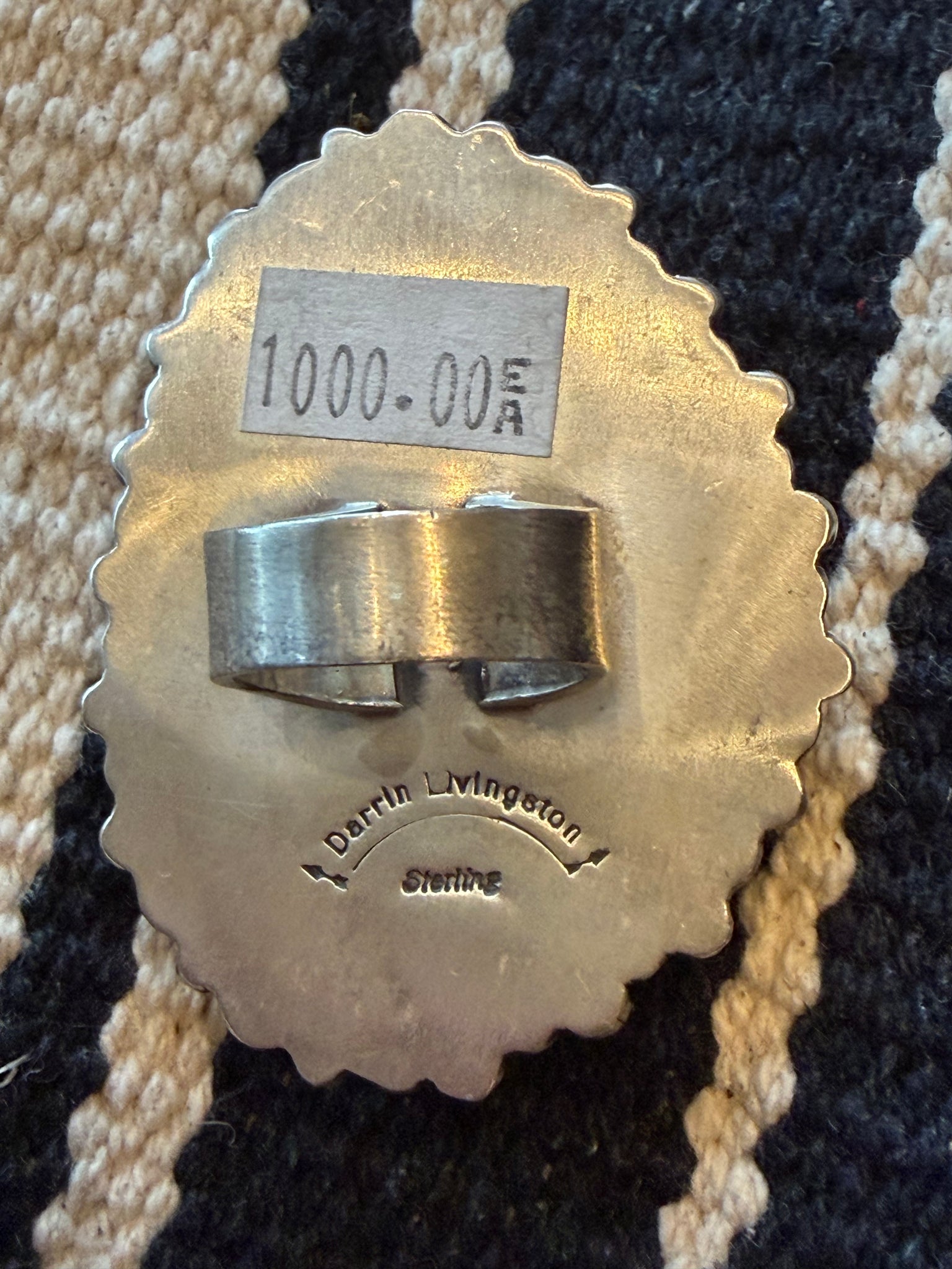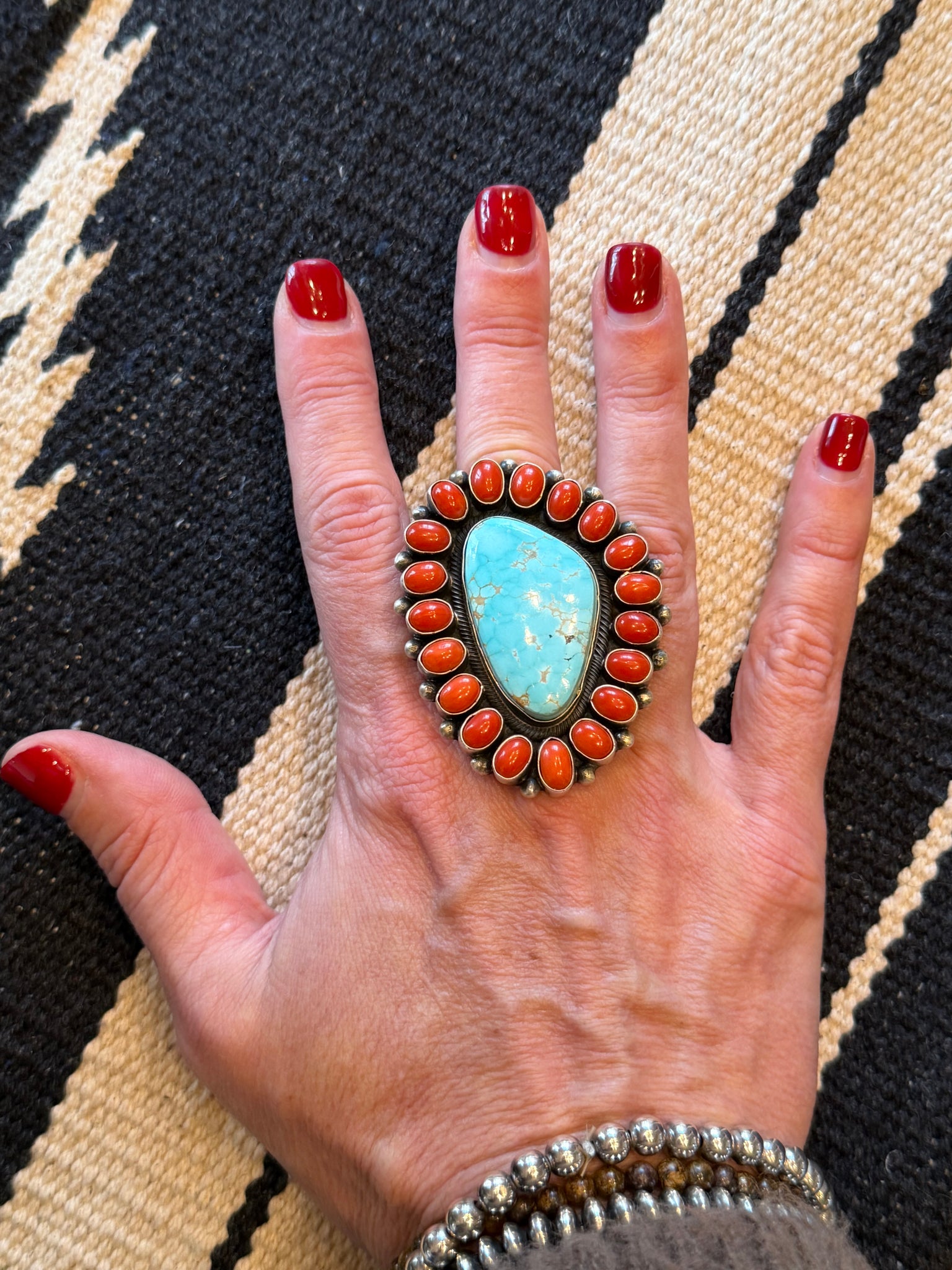 Bold, timeless, and undeniably stunning, this Red Coral & Turquoise Cluster Ring is a true statement piece handcrafted in sterling silver by Native artist Darrin Livingston. Featuring a striking cluster of vibrant red coral and classic blue turquoise, this ring captures the beauty of traditional Southwestern design with a confident, wearable presence.